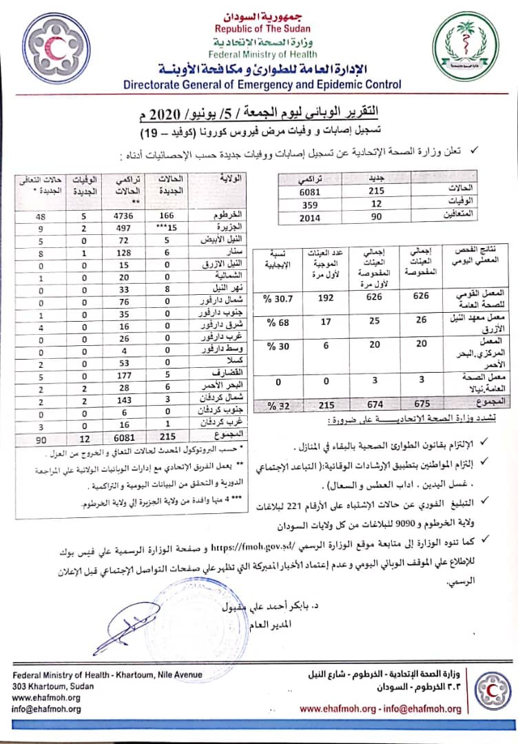 أصدرت وزارة الصحة السودانية تقريرها اليومي عن حالات كورونا بالسودان ، ويغطي التقرير يوم الجمعة 5 يونيو ، واعلنت فيه تسجيل 215 اصابة جديدة بالفايروس و 12 حالات وفاة جديدة به. وتماثلت 90 حالة للشفاء، رافعة عدد المتعافين الى 2014.