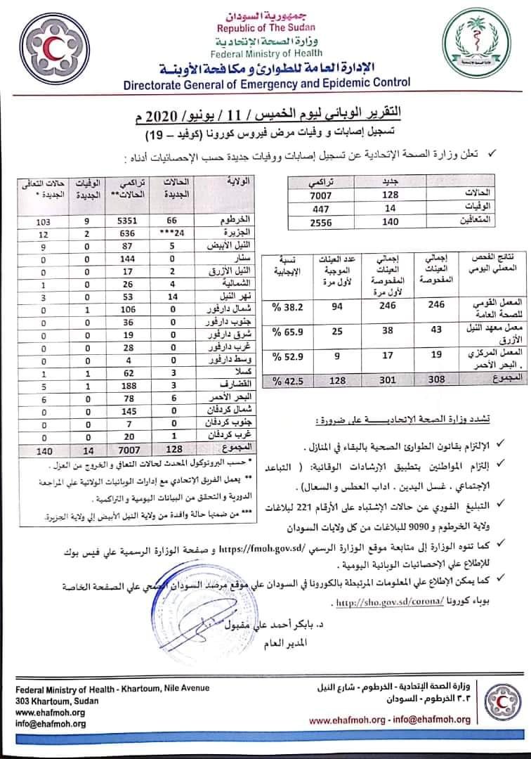 أعلنت وزارة الصحة السودانية مساء السبت عن التقرير اليومي لحالات كورونا بالسودان والذي يغطي يوم الخميس 11 يونيو. واعلنت الوزارة عن تسجيل 128 حالة جديدة، و14 حالة وفاة ، و140 حالة شفاء.