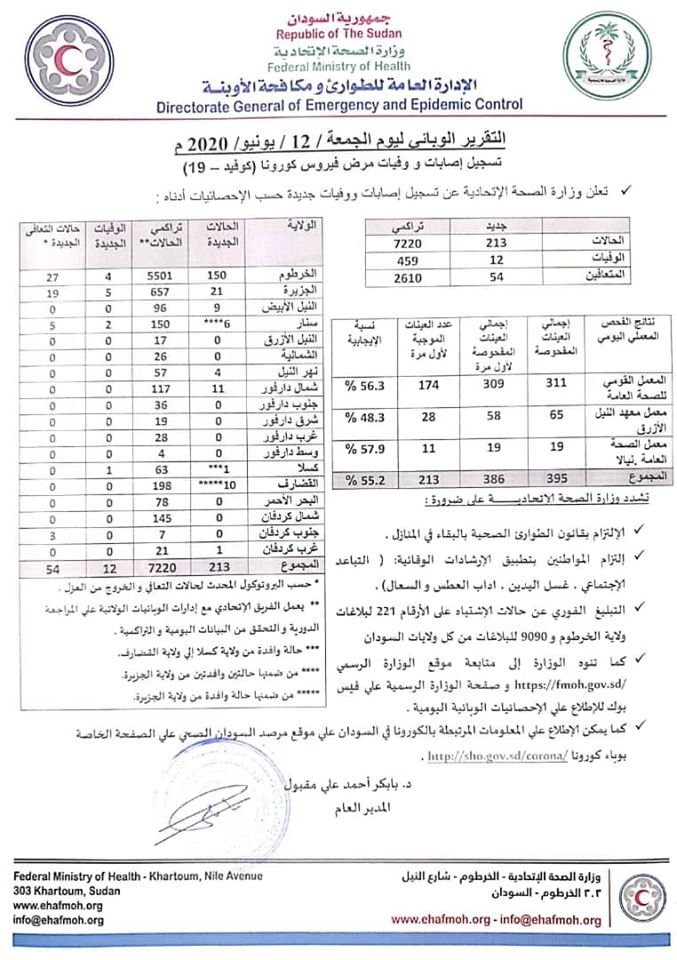 وبهذا يرتفع عدد الحالات في السودان الى 7220 حالة مؤكدة و 459 حالة وفاة، و2610 حالة شفاء.