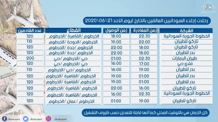 نشر مطار الخرطوم الدولي جدول الرحلات الاستثنائية التي يستقبلها يوم الأحد 21 يونيو لإستقبال السودانيين العالقين في الخارج.