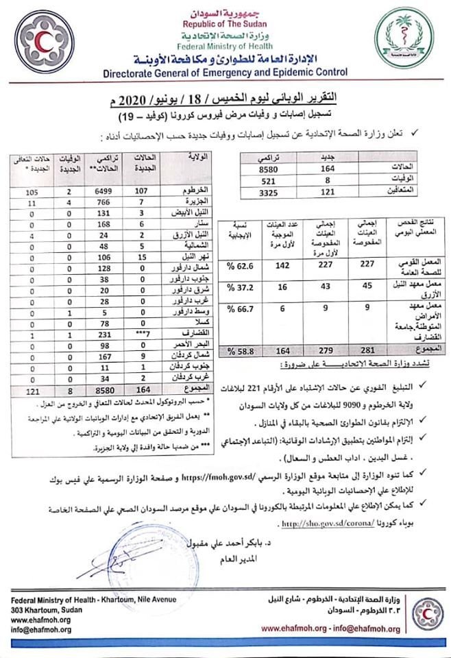 وبهذا يرتفع عدد الحالات في السودان الى 8580 حالة مؤكدة و 521 حالة وفاة، 3325 حالة شفاء.