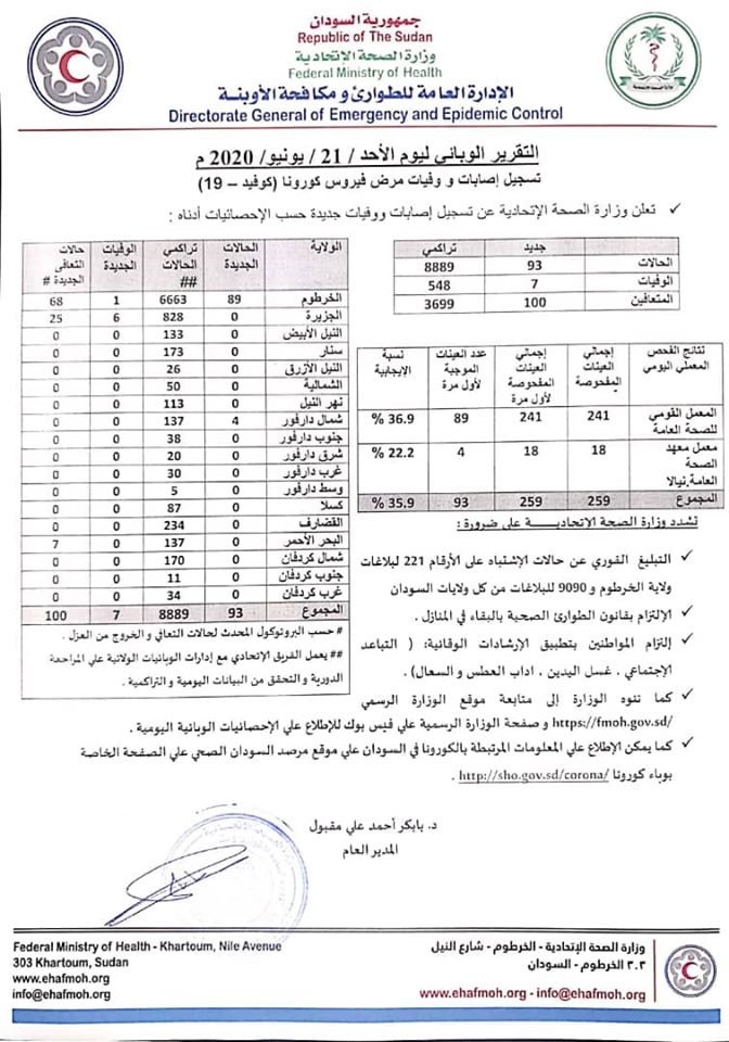 أعلنت وزارة الصحة السودانية التقرير اليومي لحالات كورونا بالسودان، والذي يغطي يوم الأحد 21 يونيو. واعلنت الوزارة عن تسجيل 93 حالة جديدة، و 7 حالات وفاة ، و 100 حالة شفاء.