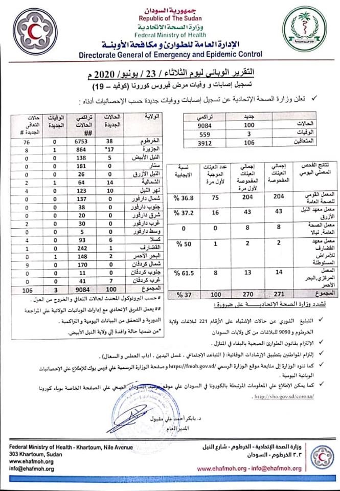 وبهذا يرتفع عدد الحالات في السودان الى 9084 حالة مؤكدة و 559 حالة وفاة، 3912 حالة شفاء