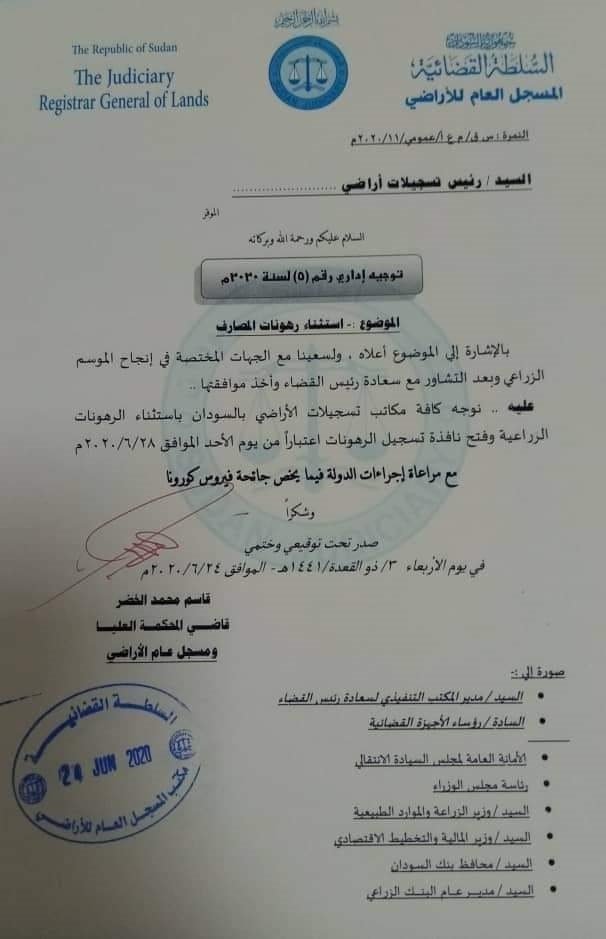 وجه مسجل عام الاراضي كافة مكاتب تسجيلات الاراضي بالسودان باستثناء الرهونات الزراعية وفتح نافذة تسجيل لها اعتبارا من يوم الاحد 28 يونيو مع مراعاة اجراءات الدولة فيما يخص جائحة كورونا .