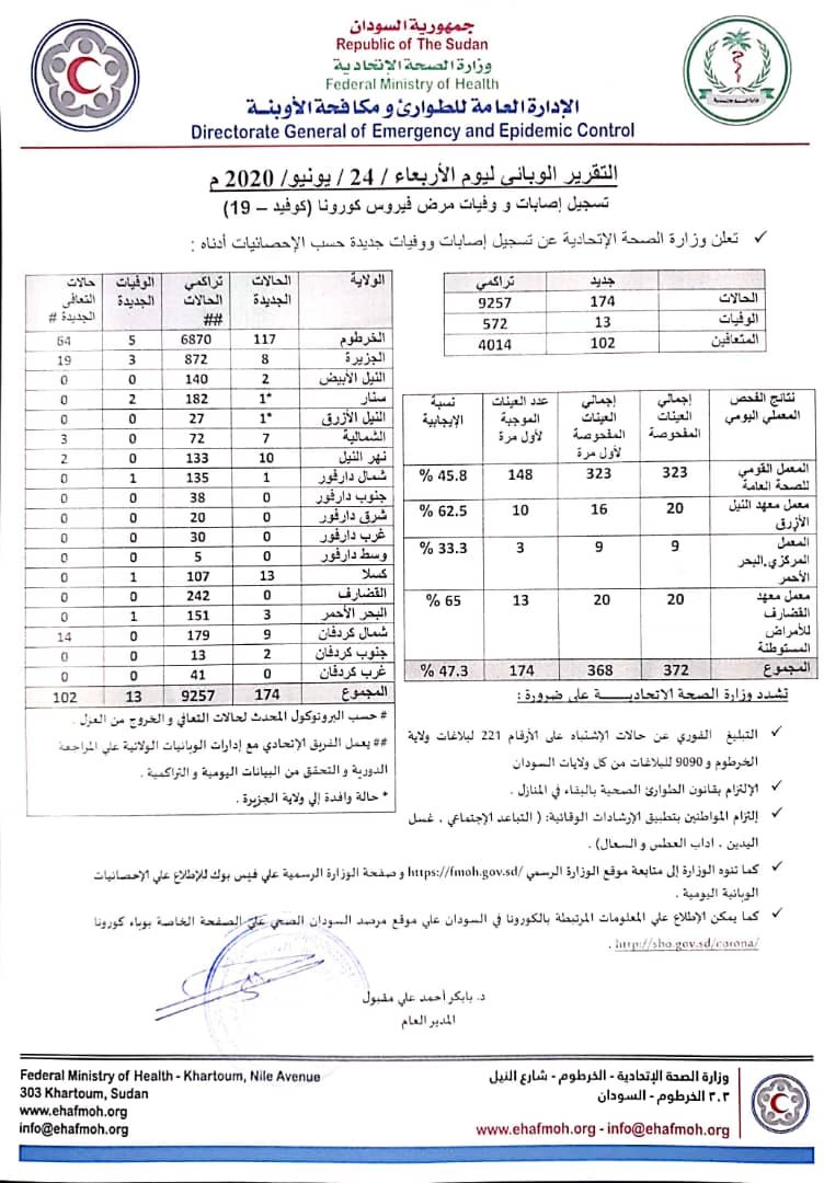 أعلنت وزارة الصحة السودانية التقرير اليومي لحالات كورونا بالسودان، والذي يغطي يوم الأربعاء 24 يونيو. واعلنت الوزارة تسجيل 174 حالة جديدة، و 13 حالة وفاة ، و 102 حالة شفاء.