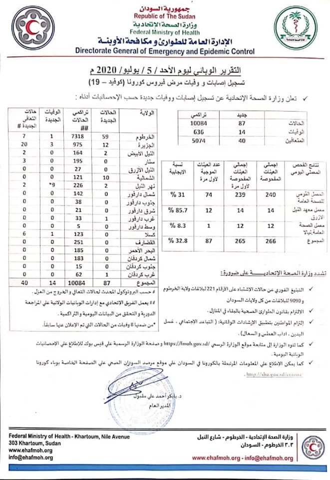 أعلنت وزارة الصحة السودانية التقارير الوبائية لفايروس كورونا ليوم الأحد 5 يوليو. وأعلنت الوزارة تسجيل 87 حالة جديدة و 14 حالة وفاة و 40 حالة تعافي.