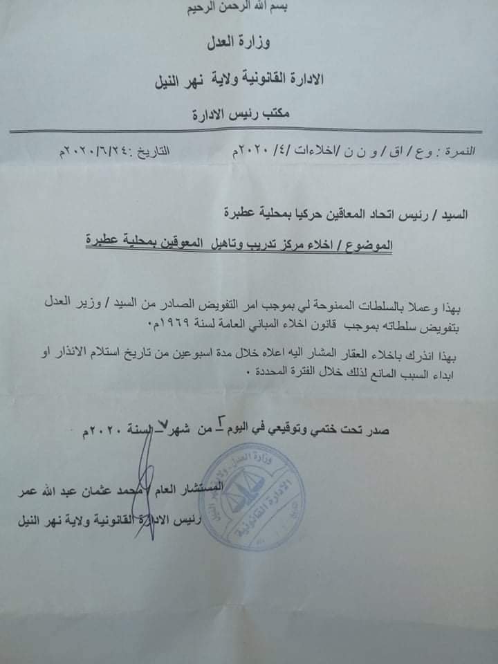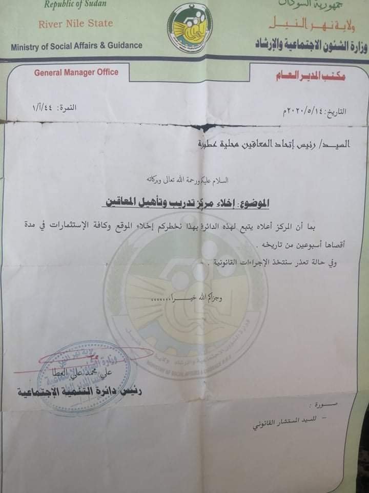 قررت وزارة الرعاية بولاية نهر النيل إخلاء مركز تدريب وتأهيل المعاقين بمدينة عطبرة.