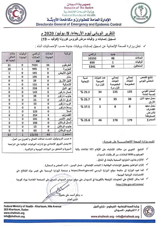 أعلنت وزارة الصحة السودانية التقارير الوبائية لفايروس كورونا ليوم الأربعاء 8 يوليو. وأعلنت الوزارة تسجيل 46 حالة جديدة و حالة وفاة واحدة و 64 حالة تعافي.