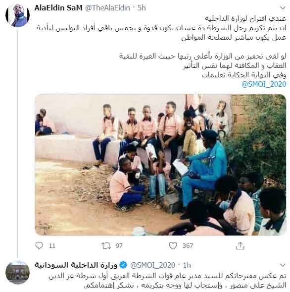 وطلب احد المدونين عبر حساب تويتر الخاص بوزارة الداخلية السودانية ان تقوم وزارة الداخلية بتكريم الشرطي، وسرعان ما ردت الوزارة على حسابها بأنها رفعت الأمر لمدير الشرطة الذي وافق ووجه بتكريم الشرطي صاحب الصورة .