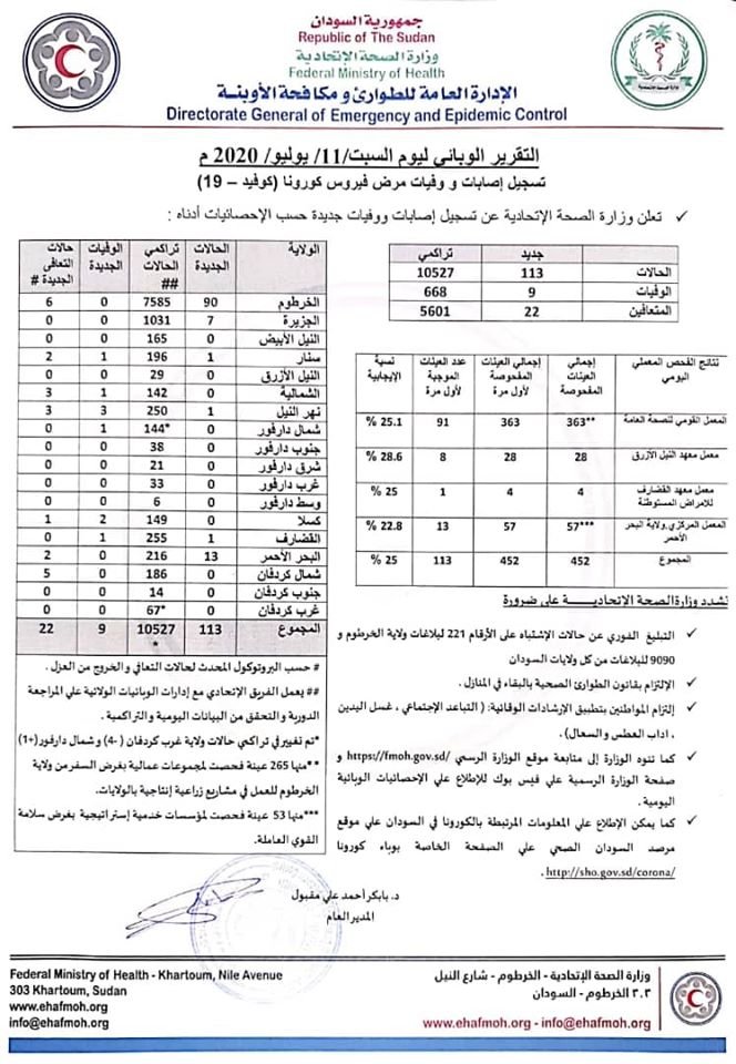 أعلنت وزارة الصحة السودانية التقارير الوبائية لفايروس كورونا ليوم السبت 11 يوليو. وأعلنت الوزارة تسجيل 113 حالة جديدة و 9 حالات وفاة و 22 حالة تعافي.