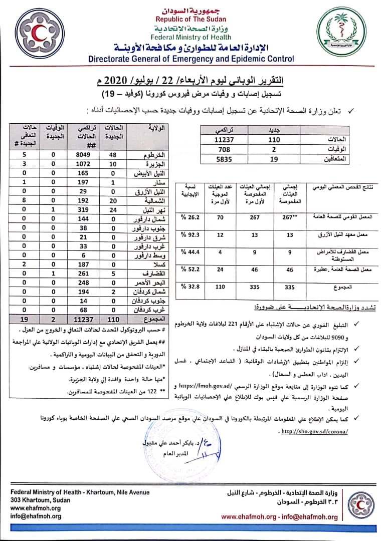 أعلنت وزارة الصحة السودانية التقارير الوبائية لفايروس كورونا ليوم الأربعاء 22 يوليو وأعلنت الوزارة تسجيل 110 حالة جديدة و حالتي وفاة و 19 حالة تعافي من الفايروس.