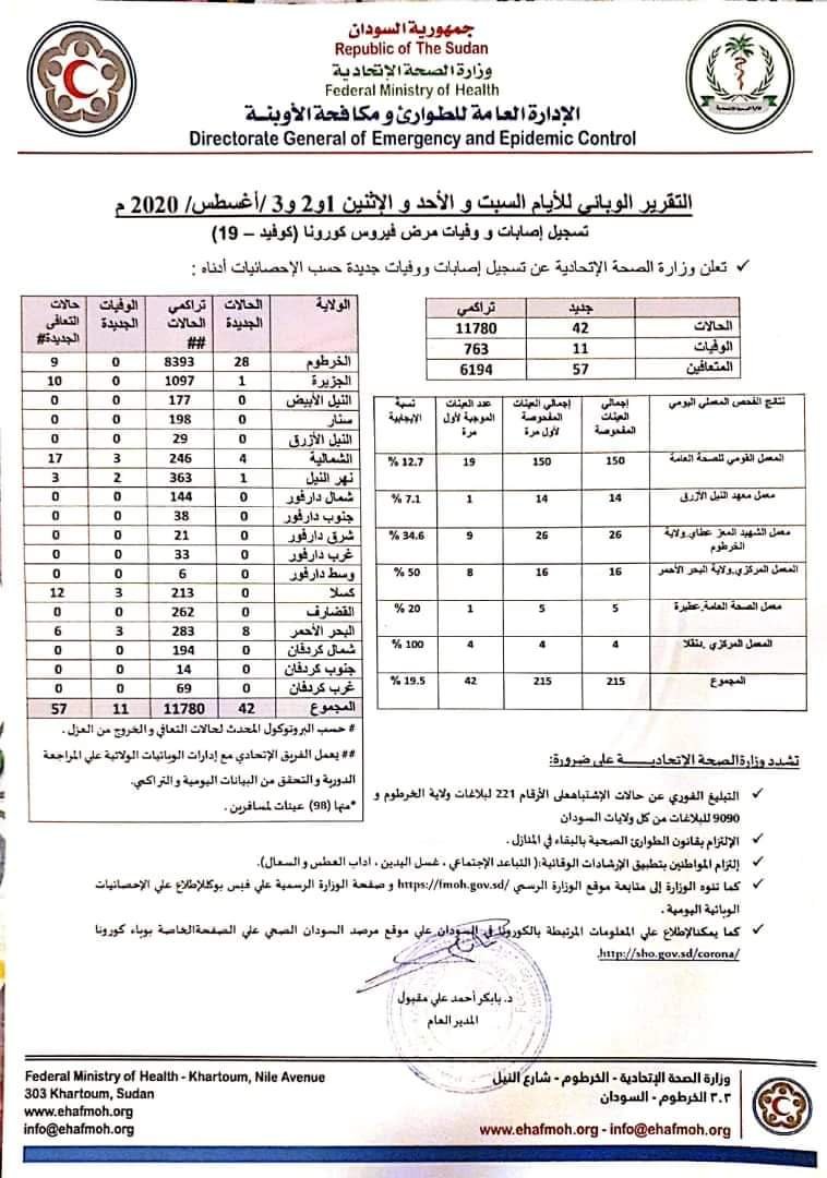 أعلنت وزارة الصحة السودانية التقرير الوبائي حول فايروس كورونا للأيام التالية لعيد الأضحى. ويشمل التقرير أيام السبت والأحد والاثنين ١ و٢و٣ اغسطس. واعلنت الوزارة عن تسجيل ٤٢ حالة جديدة في الايام الثلاثة و١١ حالة وفاة و ٥٧ حالة تعافي من الفايروس. وبلغت حصيلة الاصابات منذ بداية الانتشار في السودان ١١٧٨٠ حالة و ٧٦٣ حالة وفاة مع ٦١٩٤ حالة تعافي.