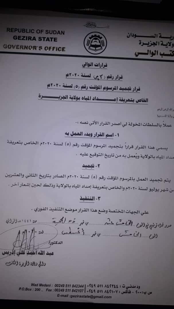 أصدر والي الجزيرة الجديد عبد الله ادريس يوم الاربعاء قراراً بتجميد الزيادة المثيرة للجدل في تعرفة مياه الشرب بالولاية. وكان قرار ولائي سابق في الثاني والعشرين من يوليو قد رفع تعرفة المياه للسكان بنسبة كبيرة قاربت 300% مما اثار جدلاً ورفضاً بين مواطني الولاية. وشرعت السلطات في تطبيق القرار السابق بالفعل وقال مواطنون انهم دفعوا رسوم المياه التي يتم تحصيلها عادة ضمن فاتورة الكهرباء بزيادة كبيرة. وبموجب قرار الوالي فانه سيتم تجميد منشور الزيادة لحين إشعار آخر.