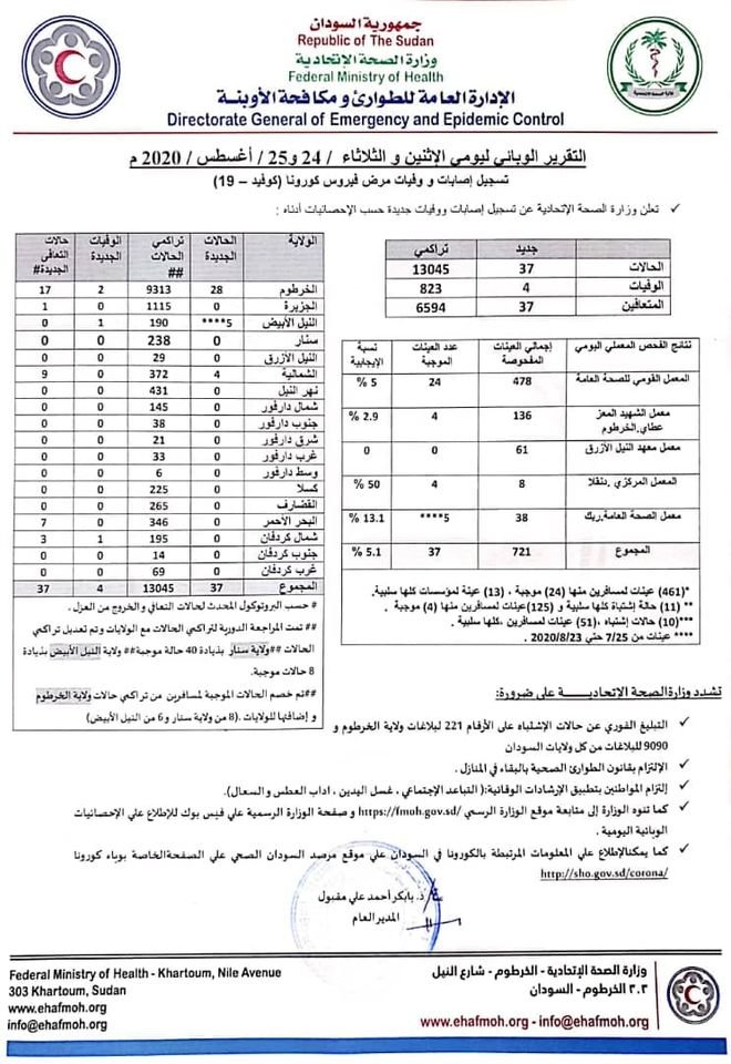 أصدرت وزارة الصحة السودانية أحدث تقارير فايروس كورونا ليومي الاثنين والثلاثاء 24 و 25 اغسطس. وتم تسجيل 37 حالة جديدة خلال هذين اليومين مع 4 حالات وفاة و 37 حالة تعافي.