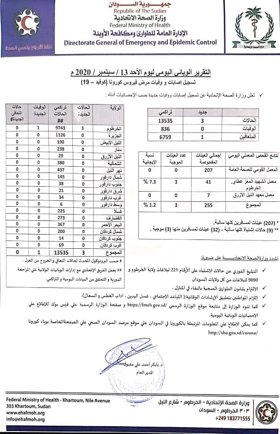 ووفقاً للتقرير، فقد بلغت جملة الحالات المرصودة في السودان منذ بدء اتشار الفايروس حتى الآن 13535 حالة إصابة ، بينها 863 حالة وفاة.