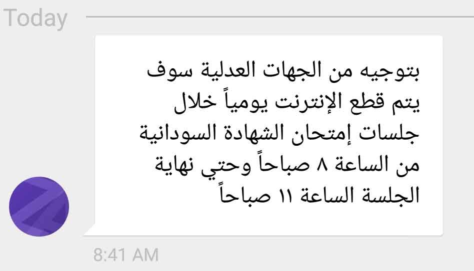 قطعت شركة زين للاتصالات خدمة الإنترنت من مشتركيها في عموم أنحاء السودان منذ الثامنة من صباح يوم الأربعاء. وقالت الشركة في رسالة لمشتركيها انها ستقطع الإنترنت يومياً من الثامنة وحتى الحادية عشرة صباحاً خلال فترة امتحانات الشهادة السودانية، وذلك بتوجيه من الجهات العدلية. وقامت شركتا سودان وام تي ان ايضاُ بقطع الخدمة عن المشتركين.