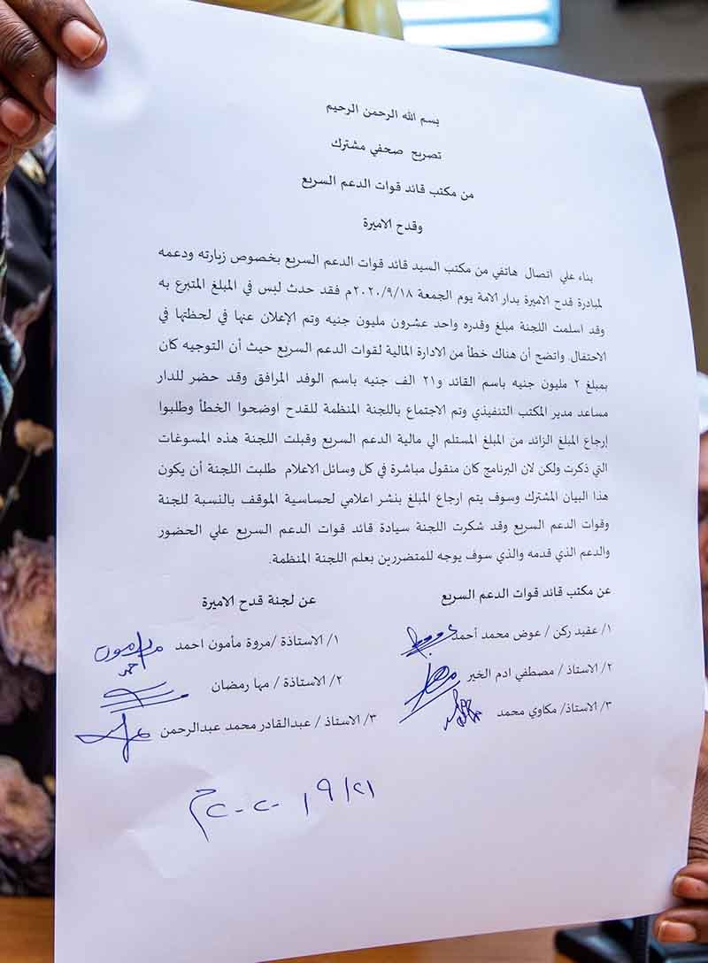 وحمل البيان توقيع كل من العقيد عوض محمد أحمد و مصطفي ادم ومكاوي محمد من مكتب حميدتي، ومروة مأمون ومها رمضان وعبدالقادر محمد من مبادرة قدح الأميرة.